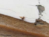 Questi piccoli acari sono dei velocissimi corridori (difficile la messa a fuoco), questo in particolare, tallonato da vicino dall'obiettivo della macchina fotografica, ha adottato un comportamento molto singolare, ha cercato di mimetizzarsi con una briciola di cibo reperita sul davanzale, se l'è sistemata sul corpo sperando di passare inosservato.