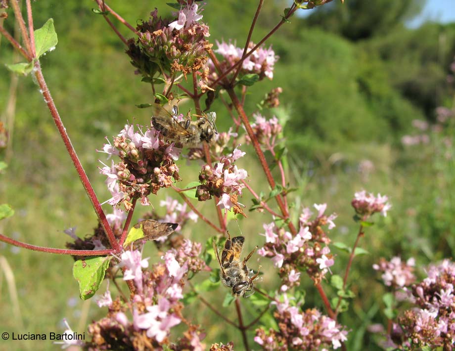 Due api attaccate con dei fili di ragnatela su una pianta di maggiorana selvatica